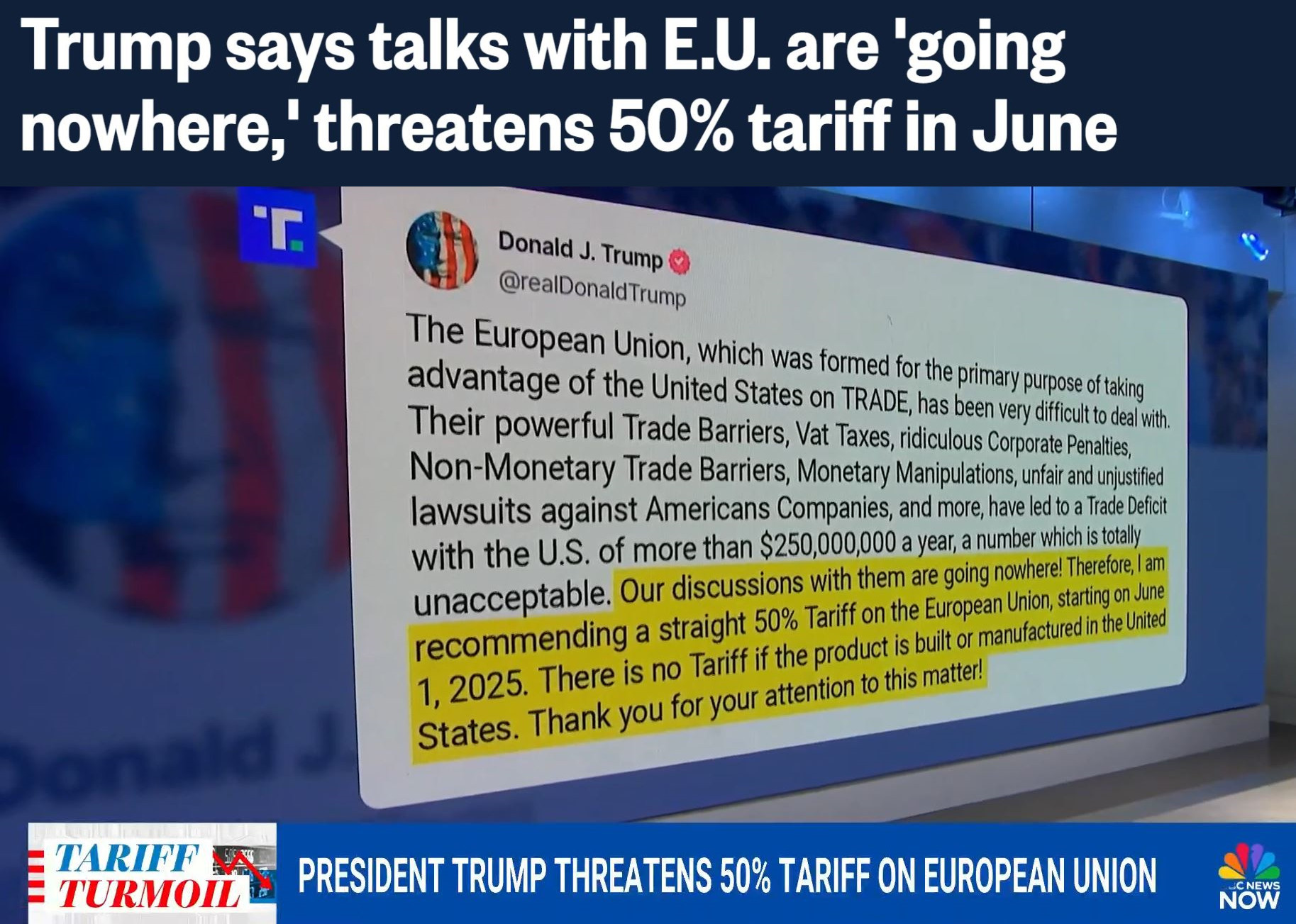 美國總統(tǒng)特朗普23日在社交媒體發(fā)文威脅稱,由于美國與歐盟的談判“毫無進展”,他建議從6月1日起對來自歐盟的商品征收50%的關(guān)稅。