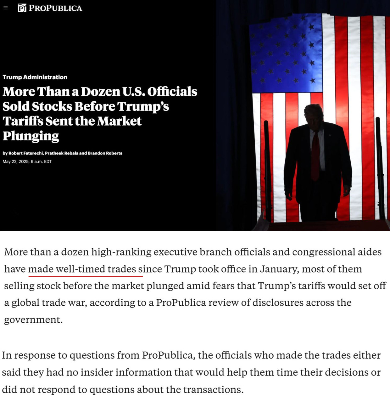 最近,美國“專業(yè)公眾”新聞?wù){(diào)查網(wǎng)站在查詢了數(shù)百份證券交易披露報告后發(fā)現(xiàn),自本屆美國政府1月上臺以來,有十幾名美國政府高級官員、國會工作人員乃至國會議員進行了時機“恰到好處”的交易,其中大部分人在美國關(guān)稅政策導(dǎo)致市場暴跌之前拋售了股票;還有人則在相關(guān)法案獲批前“及時”購買了該法案所利好的行業(yè)公司股票。