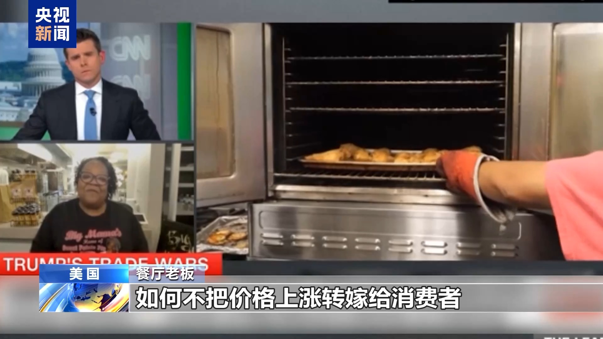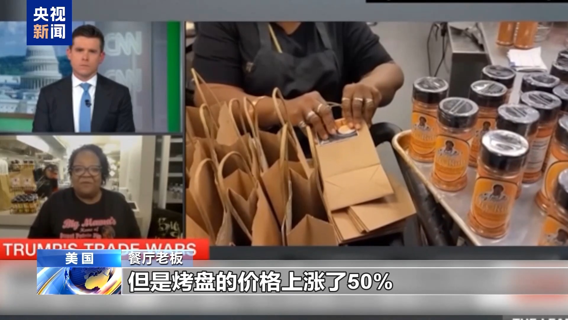 餐廳老板:我們餐廳的炸雞產(chǎn)品上過電視臺的節(jié)目,我們也在線上賣調(diào)料產(chǎn)品,這是關稅影響最大的地方。另外就是餐廳的供應,比如我們使用谷物面包,我們一般用鋁箔烤盤制作面包,但是烤盤的價格上漲了50%,所以我們現(xiàn)在換回平底鍋制作面包。