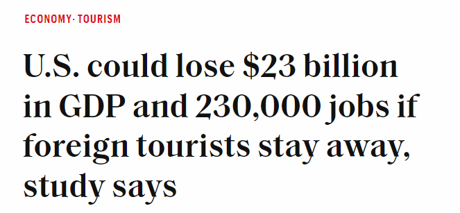 經(jīng)濟分析公司Implan首席經(jīng)濟學家珍妮弗·索瓦爾德森(Jennifer Thorvaldson)測算稱,基于3月份外國游客赴美人數(shù)下降的情況,若今年國際游客減少10%,不僅美國國內生產(chǎn)總值(GDP)將損失230億美元,還會損失大約23萬個工作崗位。