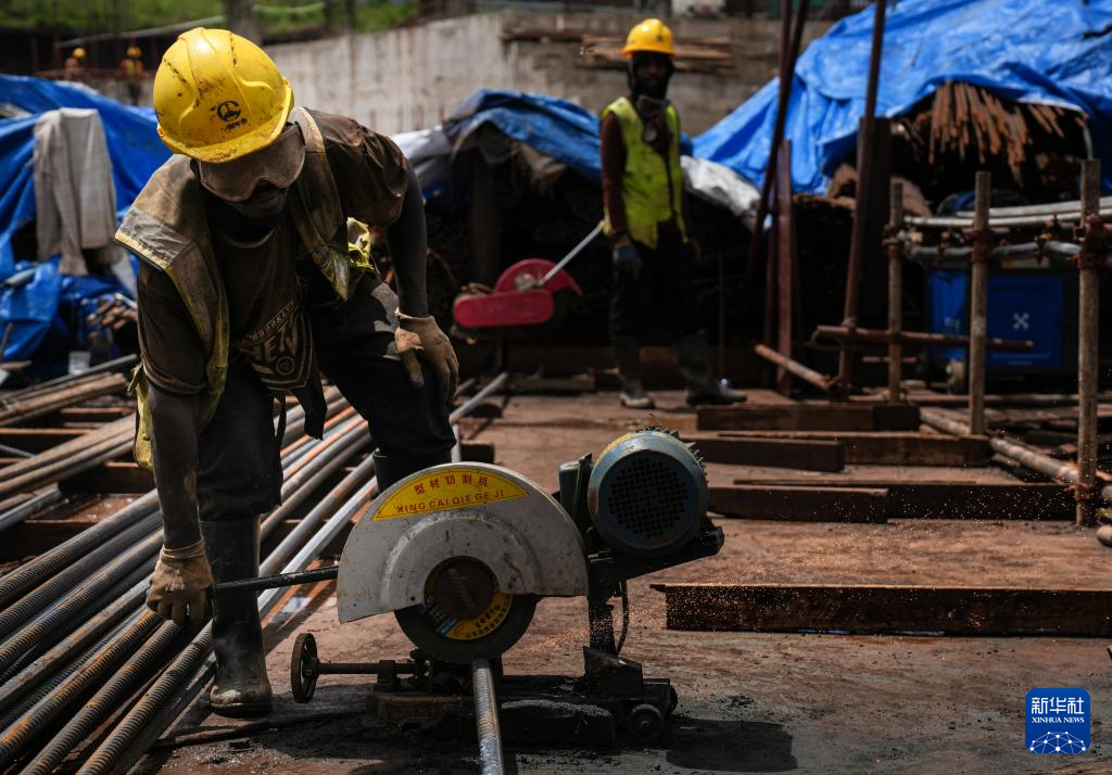 4月25日,在坦桑尼亞阿魯沙綜合體育場項(xiàng)目上,工人用切割機(jī)切割鋼筋。新華社記者 李亞輝 攝