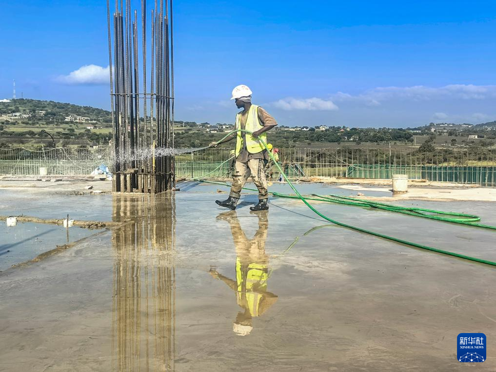 2月10日,在坦桑尼亞阿魯沙綜合體育場項(xiàng)目上,工人進(jìn)行混凝土養(yǎng)護(hù)作業(yè)。新華社發(fā)(中國中鐵建工集團(tuán)有限公司供圖)