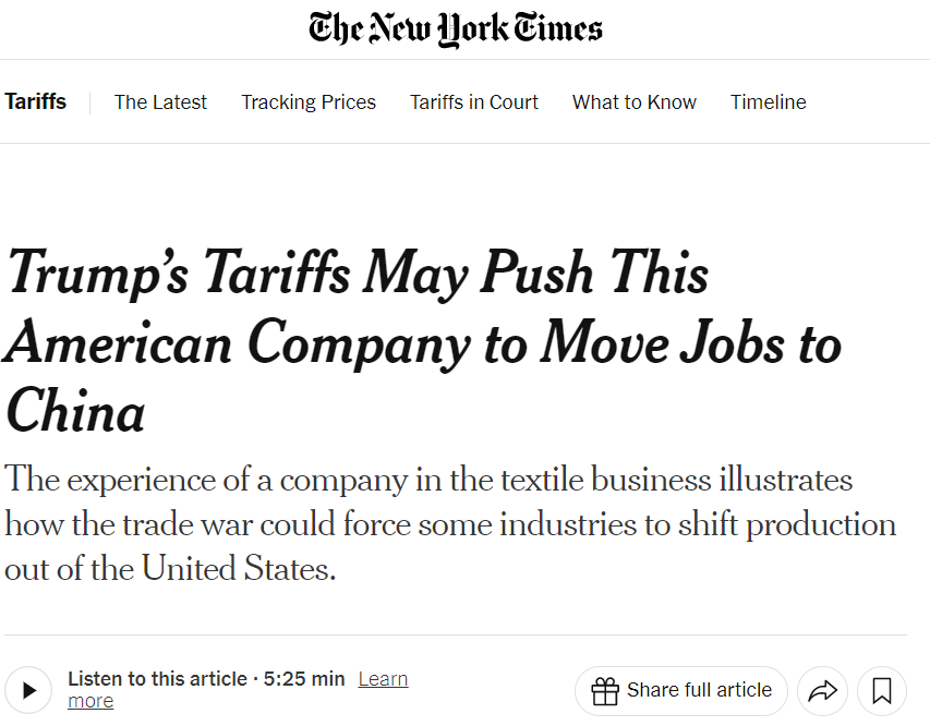 文章說,特朗普政府發(fā)起的全球貿(mào)易戰(zhàn)動(dòng)搖了Cocona Labs公司的經(jīng)濟(jì)基礎(chǔ)。受到美國關(guān)稅不確定性的影響,加之中國實(shí)施的對(duì)等反制措施,這家美國公司將開始做出改變:將其核心產(chǎn)品的部分生產(chǎn)從美國轉(zhuǎn)移到中國的工廠生產(chǎn)。