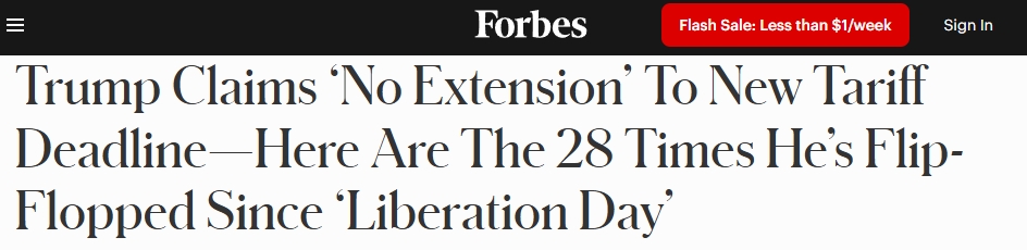 對于此次關(guān)稅調(diào)整,《福布斯》雜志網(wǎng)站7日報道指出,從今年2月7日首次公開提及對他國進口商品征收全面關(guān)稅,到強調(diào)“2025年8月1日這一日期不會有任何延長”的這五個月里,特朗普政府在關(guān)稅問題上的態(tài)度“翻轉(zhuǎn)”了大約28次。