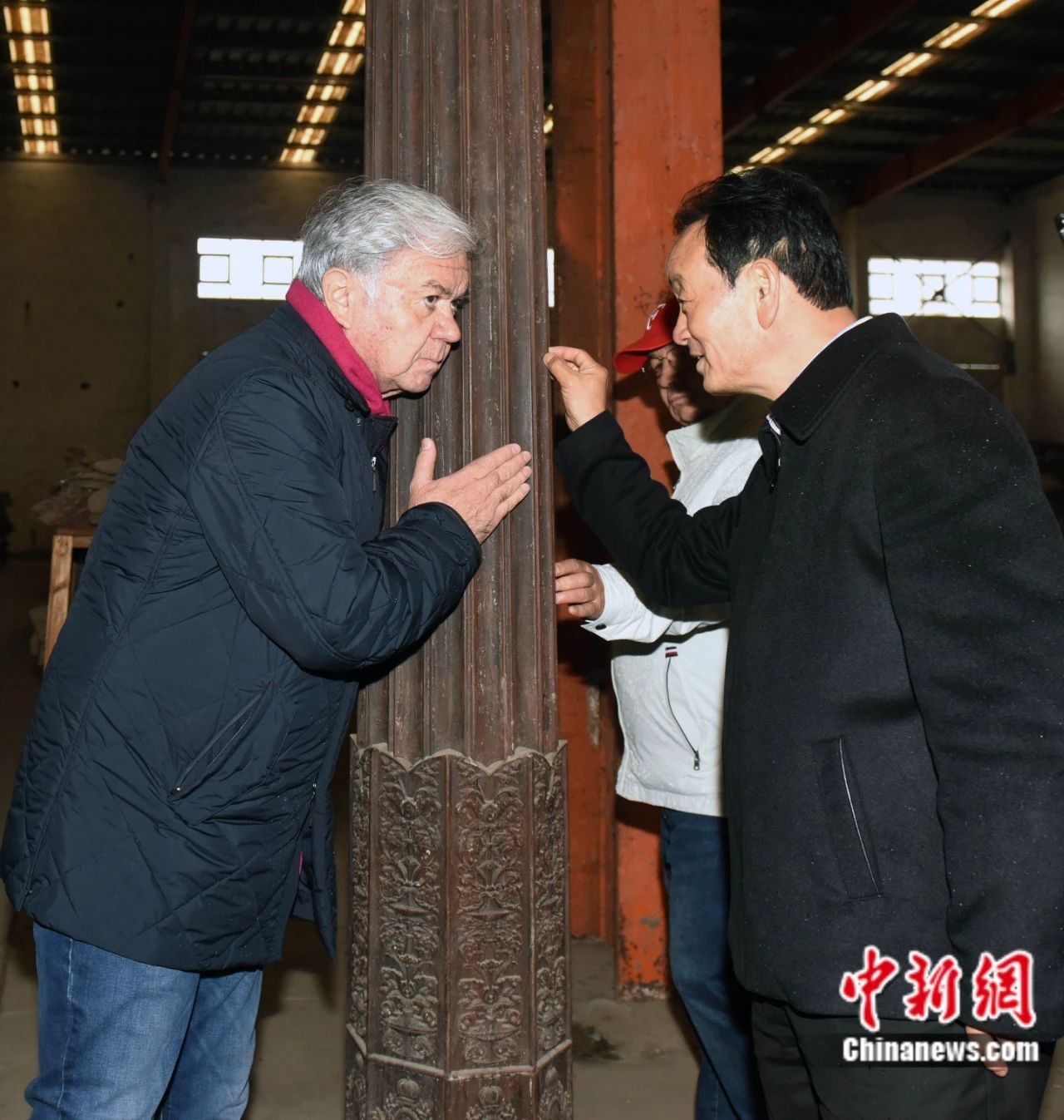2018年11月7日,拉希德·阿利莫夫(左一)作為時(shí)任上合組織秘書長(zhǎng),來(lái)到安徽蚌埠“湖上升明月”中華古民居博覽園參觀考察。圖為拉希德·阿利莫夫在細(xì)細(xì)傾聽來(lái)自敲打老木頭的聲音。中新社發(fā) 鐘欣 攝