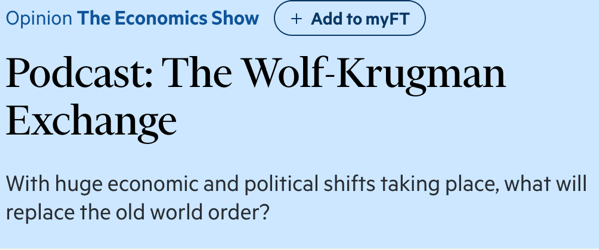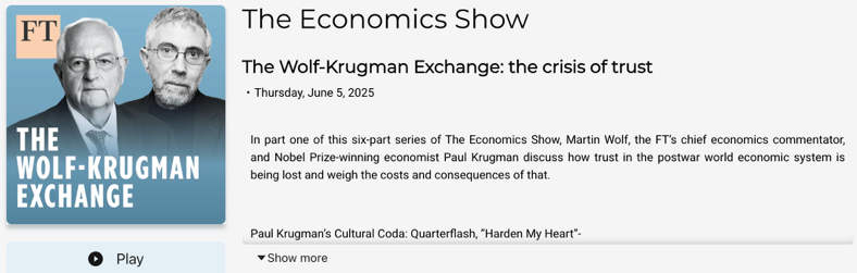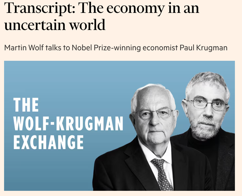 在美國關稅政策再成焦點之際,諾貝爾經濟學獎得主保羅·克魯格曼(Paul Krugman)近日接受英國《金融時報》播客節(jié)目邀請,與《金融時報》首席經濟評論員馬丁·沃爾夫(Martin Wolf)展開對話,制作推出六期特別節(jié)目《沃爾夫-克魯格曼對話》,討論了美國在特朗普政府政策下面臨的信任危機和治理崩潰的風險,特別對特朗普政府的貿易與關稅政策進行了罕見的系統(tǒng)性批評。