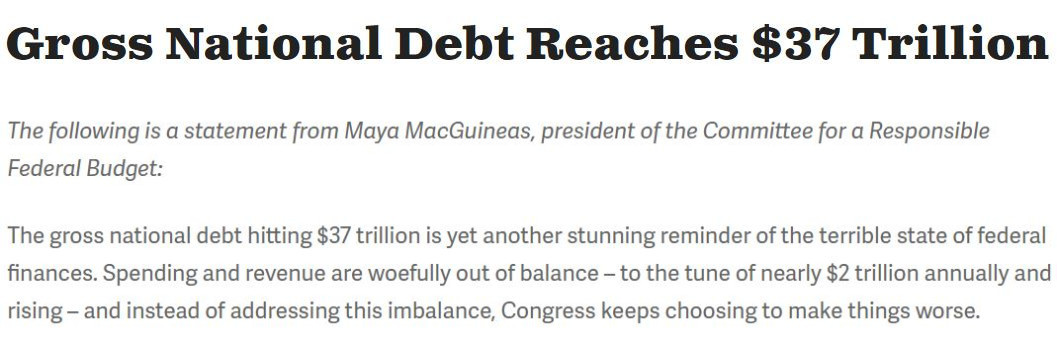 “(美國)國家債務(wù)總額達(dá)到37萬億美元的現(xiàn)實(shí)再次令人震驚地凸顯出聯(lián)邦財(cái)政的糟糕狀況。支出和收入嚴(yán)重失衡每年造成近2萬億美元的財(cái)政赤字,然而美國國會(huì)不僅沒有解決這種財(cái)政失衡,反而一直選擇讓事情變得更糟。”