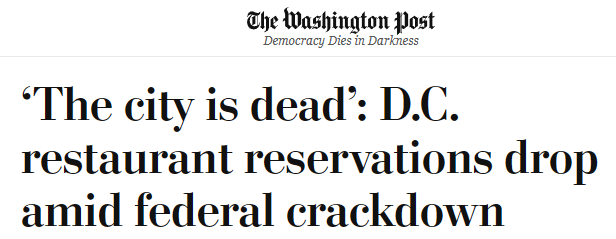 美國(guó)首都被“軍管”的這幾天,犯罪率有沒(méi)有打下來(lái),民主共和兩黨各說(shuō)各話;但眾多當(dāng)?shù)夭蛷d公開(kāi)抱怨,餐飲業(yè)營(yíng)收因美國(guó)政府的“執(zhí)法行動(dòng)”遭受了重大打擊,“今年8月對(duì)華盛頓的餐廳來(lái)說(shuō)格外艱難”。