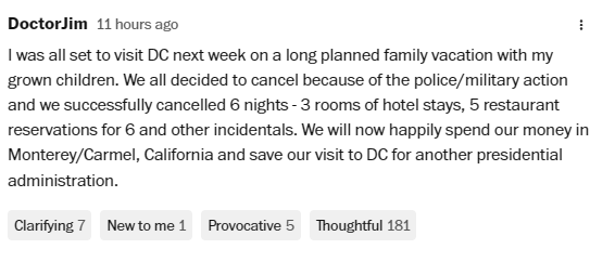 另一位網(wǎng)友則認(rèn)為,導(dǎo)致人們不敢去首都的原因是當(dāng)?shù)氐脑愀庵伟玻绻婺芸繌?qiáng)硬執(zhí)法把犯罪率打下來(lái),那游客自然會(huì)回到華盛頓特區(qū)。