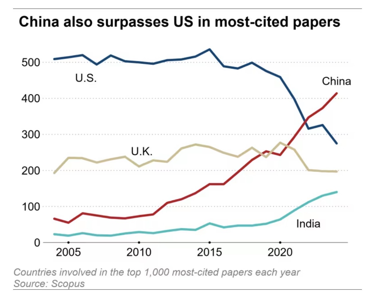 文章表示,中國氣候變化研究論文在其他文獻中的引用次數(shù)也在顯著增加——這是研究質(zhì)量的一個重要標志。從2004年到2024年,每年被引用次數(shù)最多的1000篇論文中,中國在2022年超越美國,占據(jù)了領先地位。
