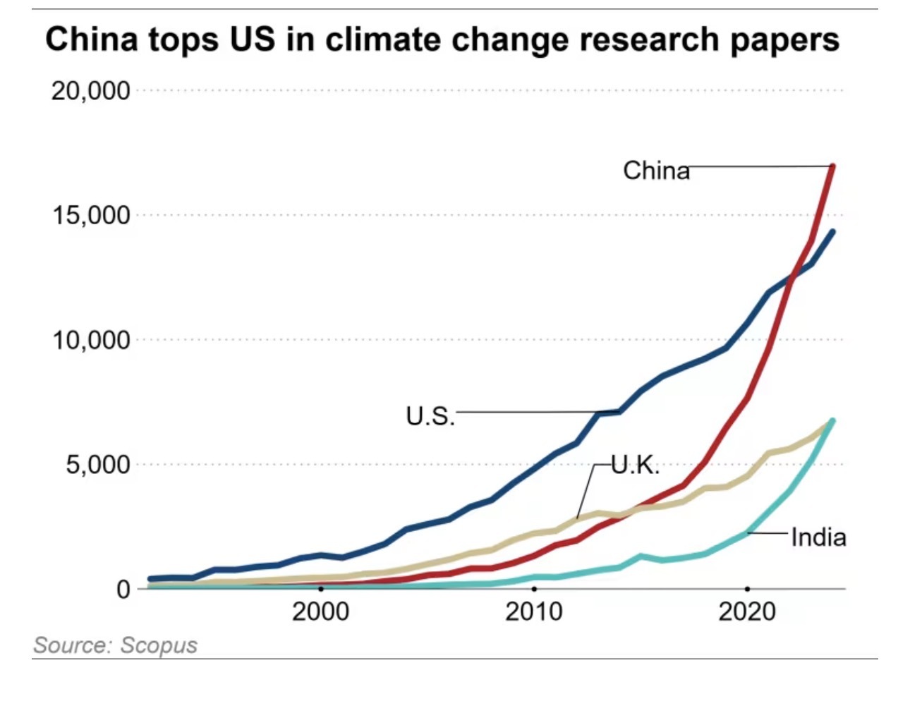 文章說,2023年,中國研究機構發(fā)表了約1.4萬篇氣候變化研究論文,而美國機構的論文數(shù)量為1.3萬篇。2024年,這一差距進一步擴大。當年全球發(fā)表的7.7萬篇氣候相關論文中,中國貢獻了約1.7萬篇,而美國的論文數(shù)量僅為1.4萬篇左右。