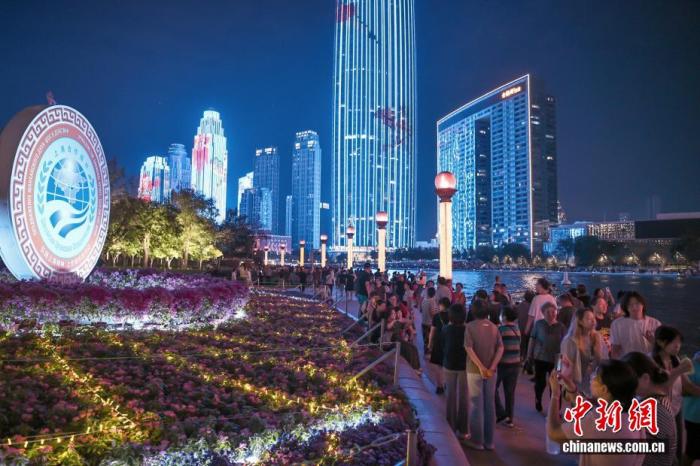 8月28日晚,市民和游客漫步天津海河畔,參觀“2025上海合作組織峰會(huì)”主題花壇。中新社記者 佟郁 攝