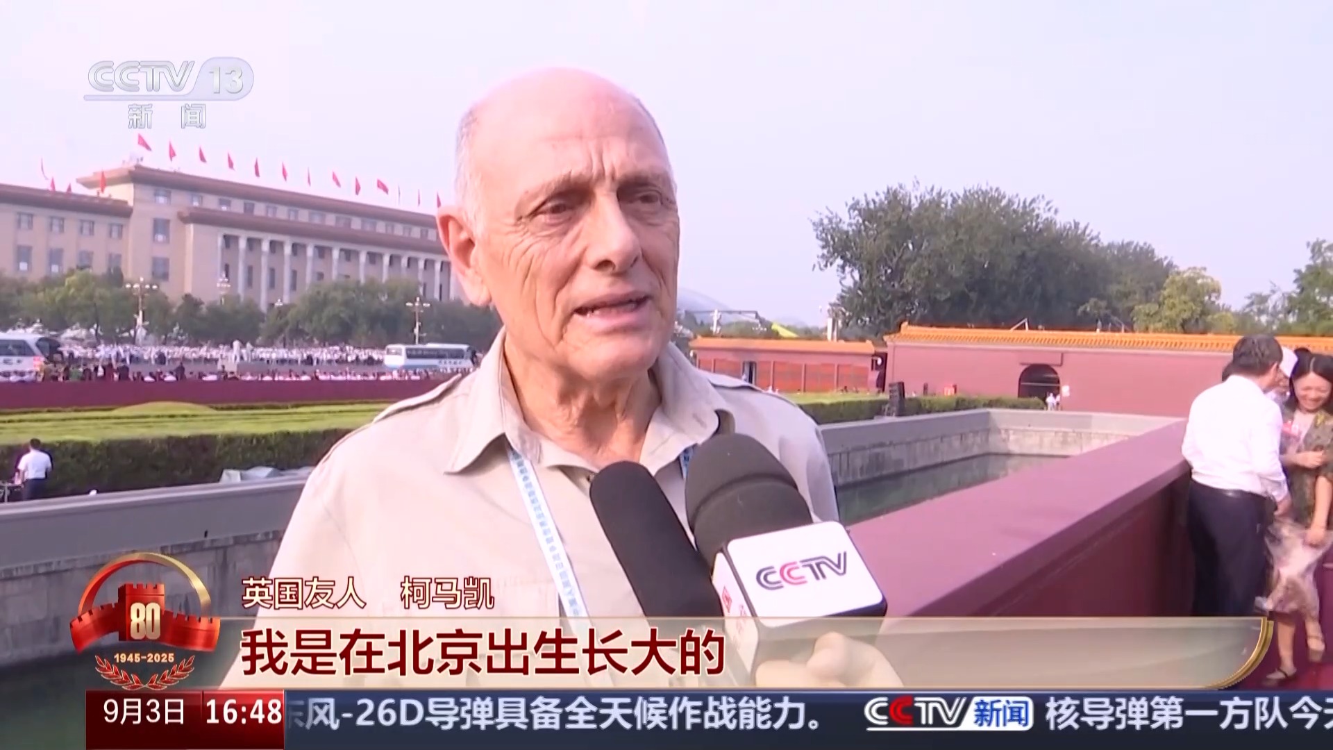 英國友人 柯馬凱:我是在北京出生長大的,我多次到天安門廣場參加各種活動。中國在國際上發(fā)揮的作用是幫助追求和平、阻止戰(zhàn)爭,我覺得不像有些國家見了戰(zhàn)爭就得站隊,而中國是去參與調(diào)停。和平發(fā)展是人民群眾最需要的。
