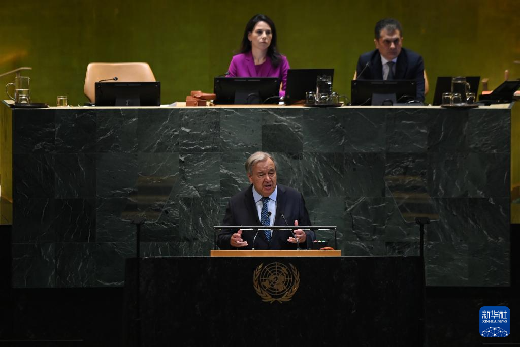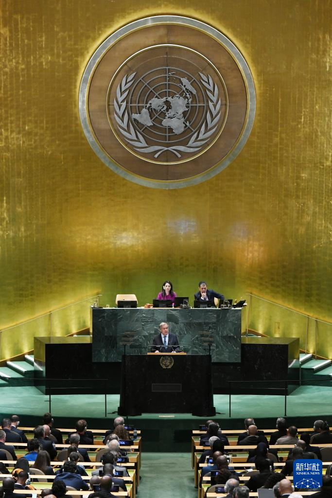 9月23日,在位于紐約的聯(lián)合國(guó)總部,聯(lián)合國(guó)秘書長(zhǎng)古特雷斯在第80屆聯(lián)合國(guó)大會(huì)一般性辯論開幕式上致辭。新華社記者李睿攝
