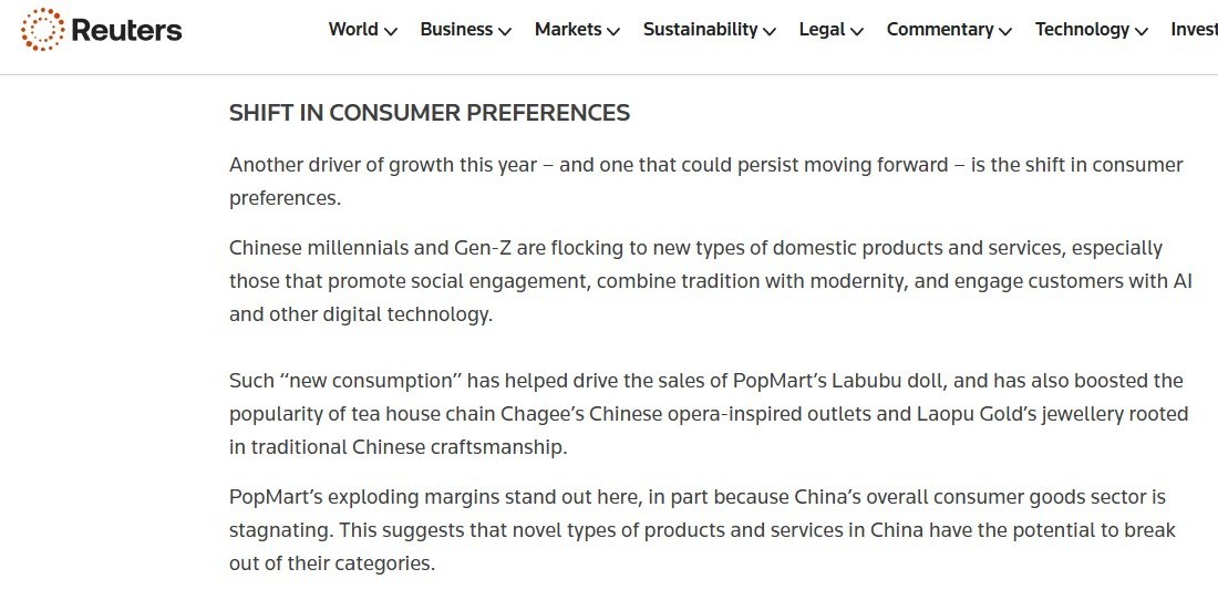 作者認(rèn)為,中國(guó)經(jīng)濟(jì)增長(zhǎng)的另一個(gè)驅(qū)動(dòng)力是消費(fèi)者偏好的轉(zhuǎn)變。中國(guó)千禧一代和 Z 世代正涌向新型國(guó)內(nèi)產(chǎn)品和服務(wù),那些可以促進(jìn)社會(huì)參與、將傳統(tǒng)與現(xiàn)代相結(jié)合、并通過(guò)人工智能和其他數(shù)字技術(shù)吸引客戶(hù)的產(chǎn)品和服務(wù)尤其受到歡迎,這種“新消費(fèi)”推動(dòng)了泡泡瑪特拉布布娃娃的銷(xiāo)售,也提升了茶館連鎖店“霸王茶姬”的中國(guó)戲曲主題門(mén)店和一些源于中國(guó)傳統(tǒng)工藝的珠寶的知名度,不僅如此,這些新興的產(chǎn)品和服務(wù)類(lèi)型還具備潛力,能夠突破現(xiàn)有類(lèi)別。