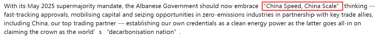 文章說,澳大利亞政府近期也公布了2035年減排目標(biāo)。澳大利亞能源部長克里斯·鮑文推出的35億澳元“家庭電池補(bǔ)貼計(jì)劃”已安裝超6萬套儲能系統(tǒng),證明政策驅(qū)動的轉(zhuǎn)型潛力。分析認(rèn)為,澳大利亞政府應(yīng)借鑒“中國速度”,加快審批流程、撬動民營資本,并在零碳產(chǎn)業(yè)領(lǐng)域深化與最大貿(mào)易伙伴——中國的合作,以確立澳大利亞在清潔能源領(lǐng)域的競爭力。
