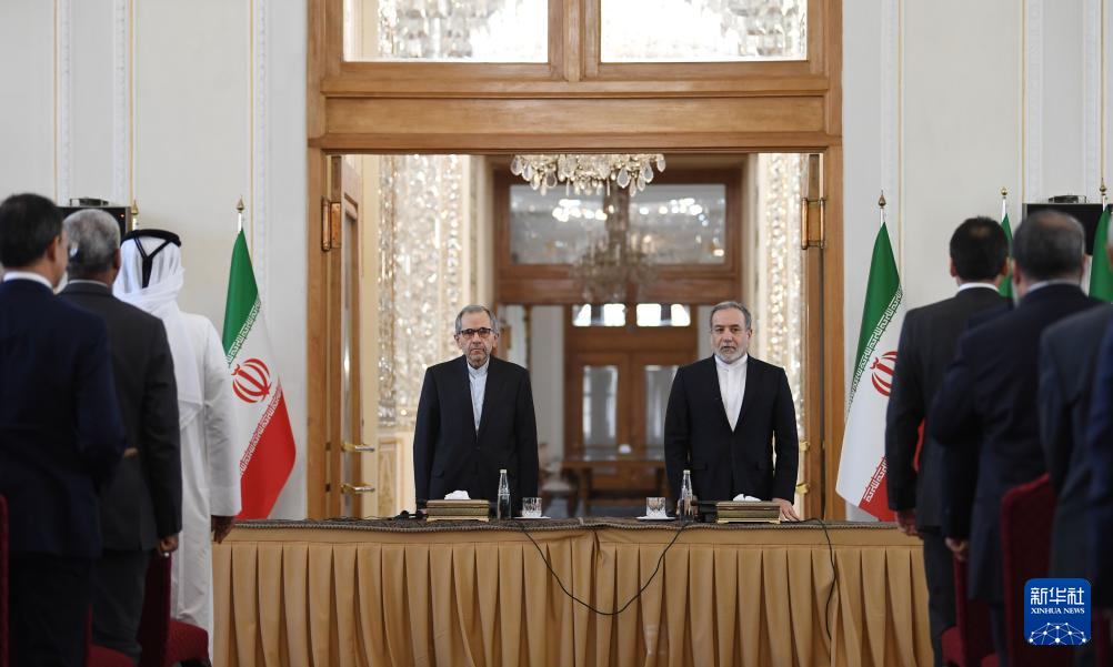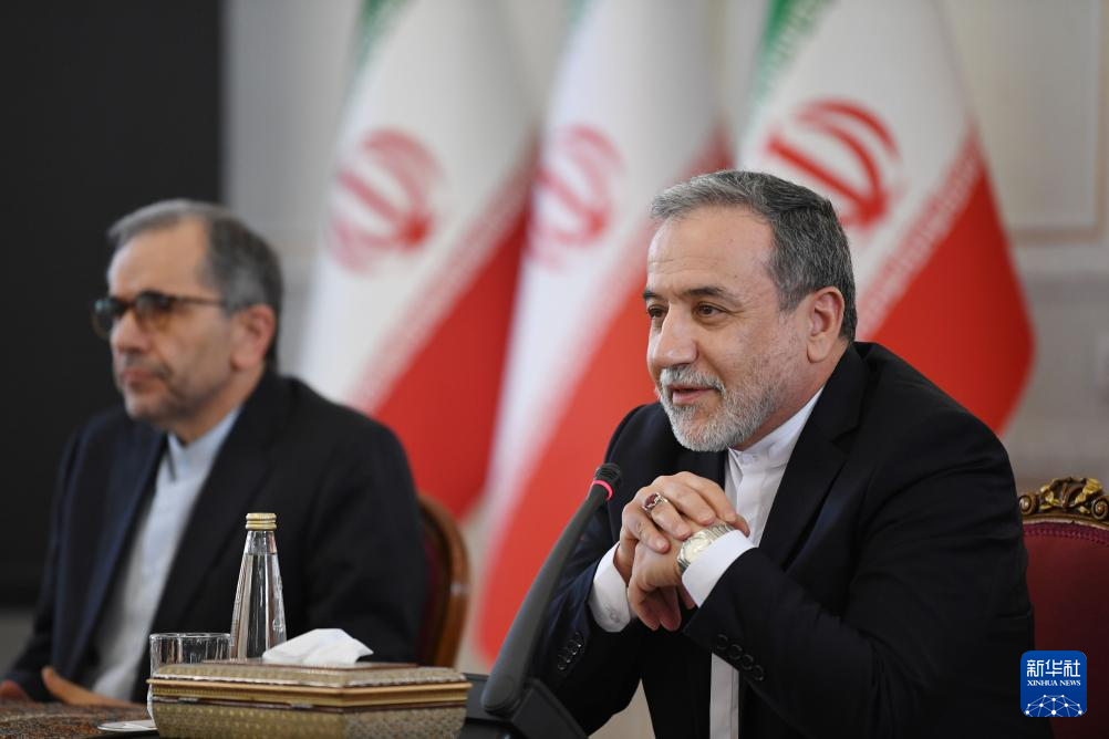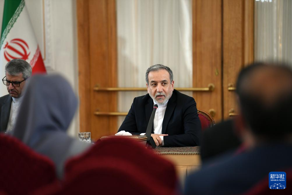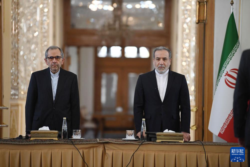 10月5日,在伊朗首都德黑蘭,伊朗外交部長阿拉格齊(右)對多國駐伊朗外交人員發(fā)表講話。新華社記者 沙達提 攝