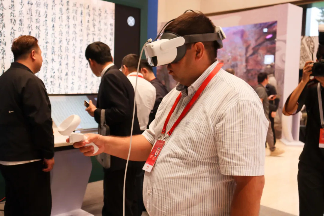 2025年9月17日,陜西西安,2025年世界互聯(lián)網(wǎng)大會(huì)文化遺產(chǎn)數(shù)字化論壇開幕。圖為外籍參會(huì)者體驗(yàn)數(shù)字化項(xiàng)目。中新社記者 李一璠 攝