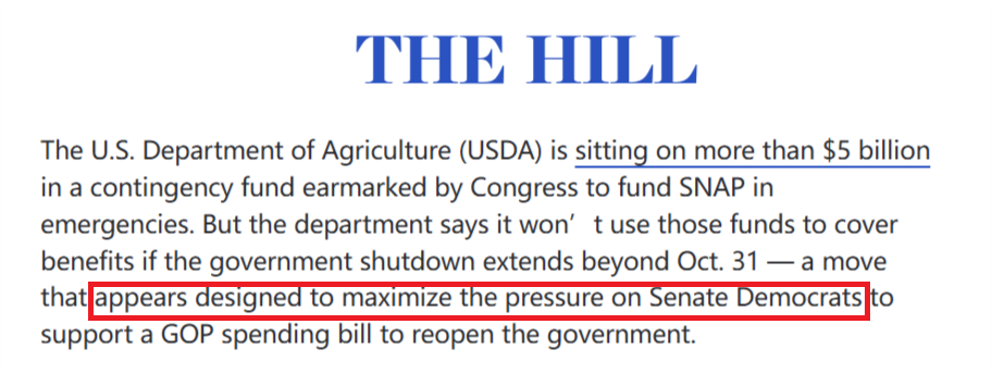 對此,美國《國會山報》直言,農(nóng)業(yè)部種種說辭顯然為了最大限度地向參議院民主黨人施壓,迫使他們支持共和黨的支出法案,以重啟政府。