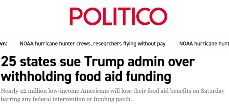 據(jù)美國《政治報》網(wǎng)站報道,受政府持續(xù)“停擺”影響,美農(nóng)業(yè)部宣布暫停其“補充營養(yǎng)援助計劃”(SNAP),11月1日起停止發(fā)放食品救濟。目前這一項目覆蓋約4200萬人,約占美國總?cè)丝诎朔种?,其中多?shù)為低收入群體和殘障人士。SNAP項目暫停后,他們的生活將難以為繼。當?shù)貢r間28日,民主黨主政的25個州和首都華盛頓對聯(lián)邦政府提起訴訟,要求動用聯(lián)邦應(yīng)急資金,以維持這一項目。