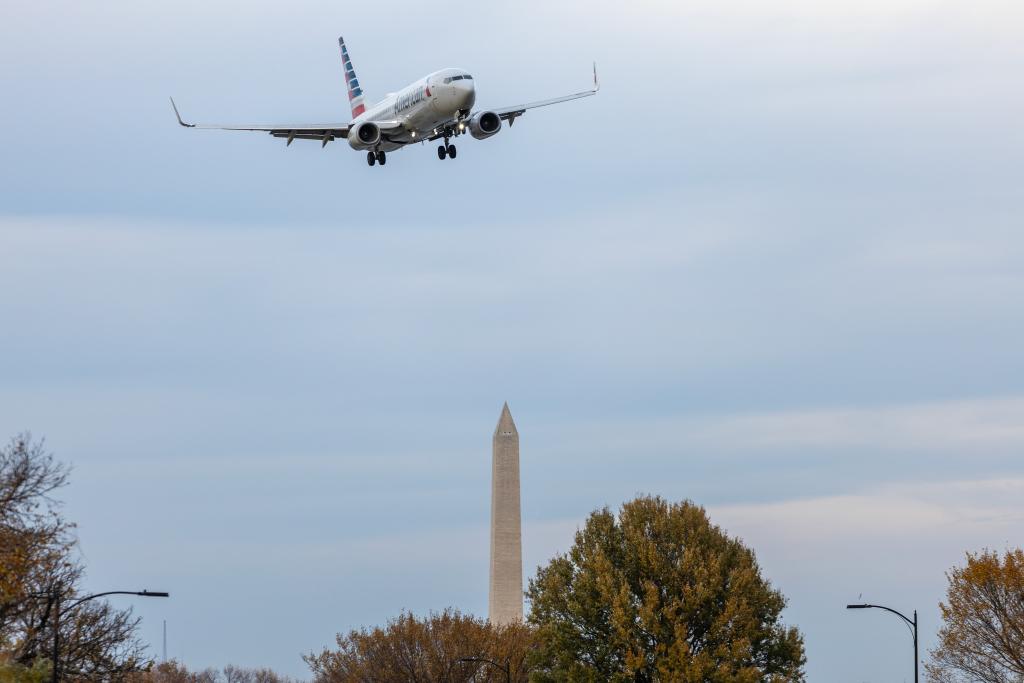 11月7日,一架美國航空公司飛機(jī)準(zhǔn)備降落在美國弗吉尼亞州阿靈頓的里根國家機(jī)場。新華社記者胡友松攝