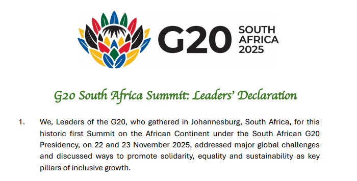 二十國集團(tuán)(G20)領(lǐng)導(dǎo)人第二十次峰會當(dāng)?shù)貢r間11月22日在南非約翰內(nèi)斯堡開幕。南非國際關(guān)系與合作部長羅納德·拉莫拉在當(dāng)天下午召開的記者發(fā)布會上表示,與會各方已就會議核心議程達(dá)成共識,并通過了《二十國集團(tuán)領(lǐng)導(dǎo)人約翰內(nèi)斯堡峰會宣言》。