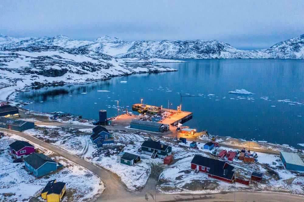 這是3月21日拍攝的丹麥自治領(lǐng)地格陵蘭島納爾薩克鎮(zhèn)的碼頭(無(wú)人機(jī)照片)。新華社記者彭子洋攝