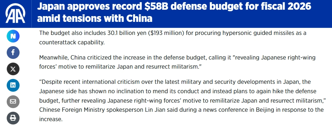日本政府12月26日批準(zhǔn)2026財(cái)年(2026年4月至2027年3月)預(yù)算案,其中防衛(wèi)預(yù)算超9萬億日元,再創(chuàng)歷史新高。其展現(xiàn)出的日本負(fù)面軍事動向,受到國際媒體關(guān)注。