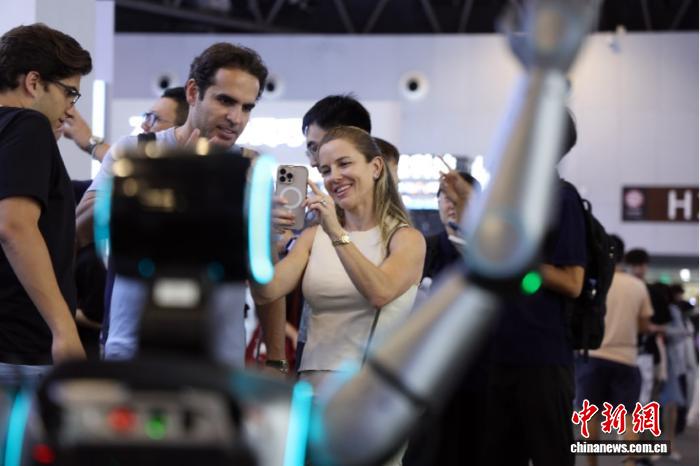 2025年7月,在上海舉辦的2025世界人工智能大會(huì)上,一款中國(guó)制造的機(jī)器人吸引外國(guó)觀眾。 中新社記者 湯彥俊 攝