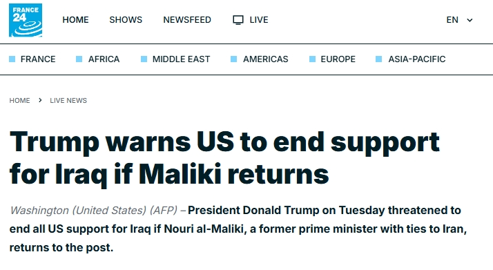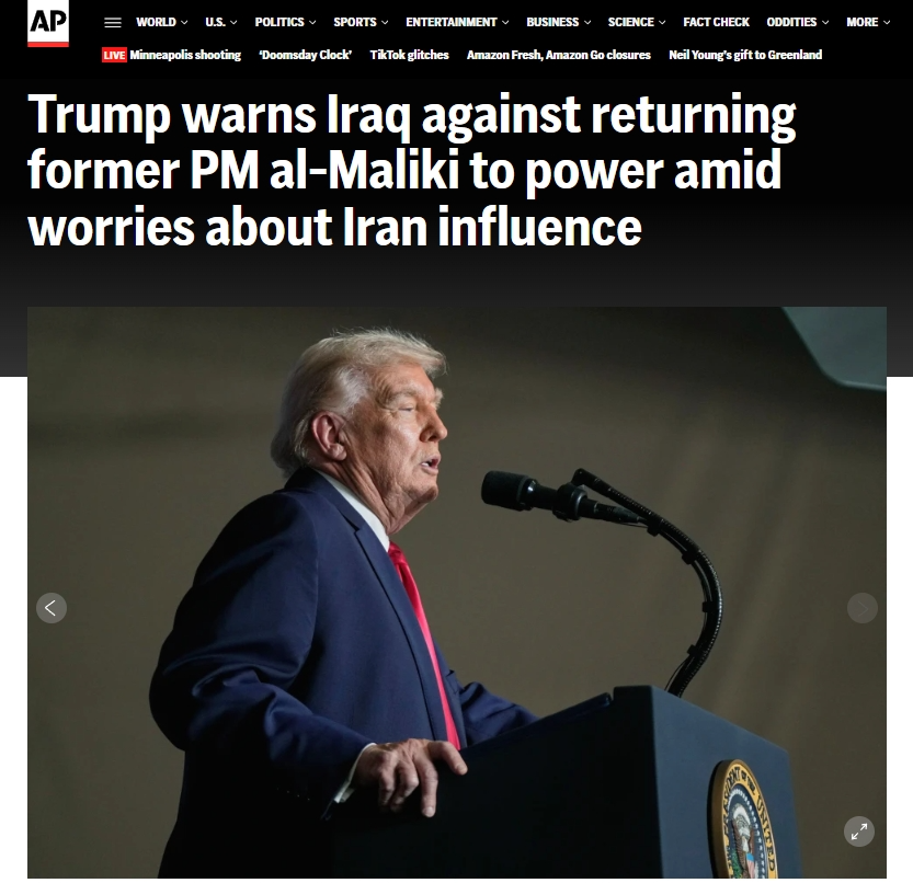 美國總統(tǒng)特朗普當(dāng)?shù)貢r(shí)間1月27日在社交媒體發(fā)文稱,如果伊拉克前總理努里·馬利基再度當(dāng)選總理,美國將不再“援助”伊拉克。