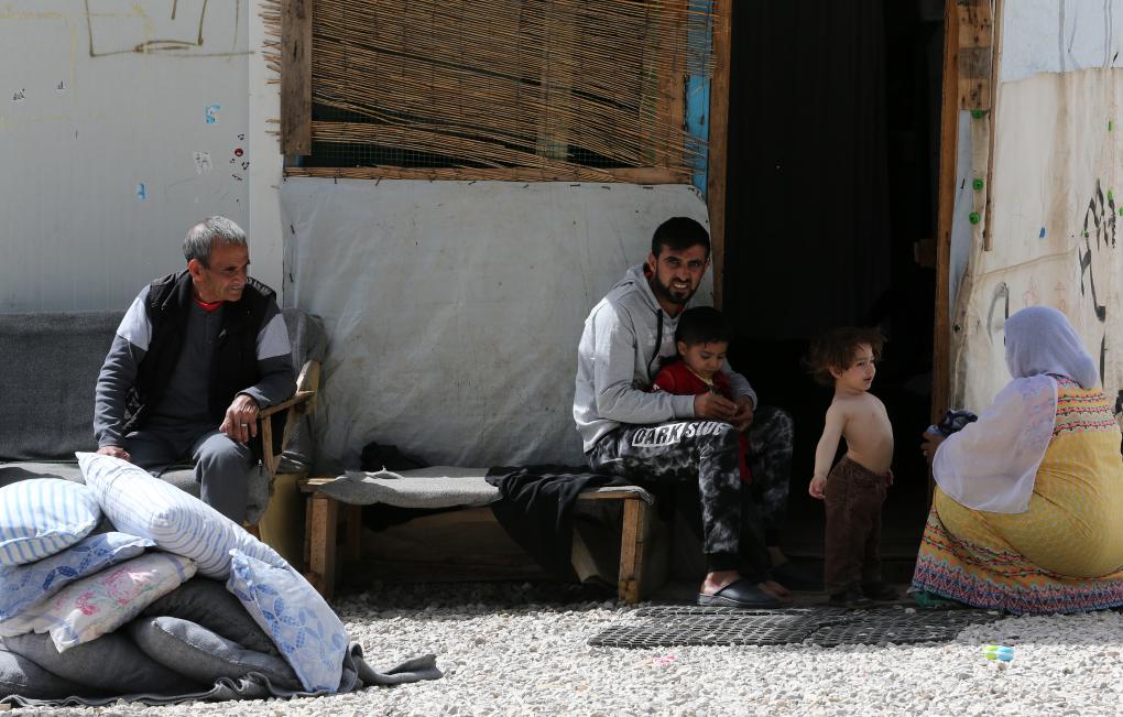 2018年4月12日,在希臘雅典以北約86公里處的里措納難民營,一對(duì)夫婦照顧孩子。新華社發(fā)(馬里奧斯·羅洛斯攝)