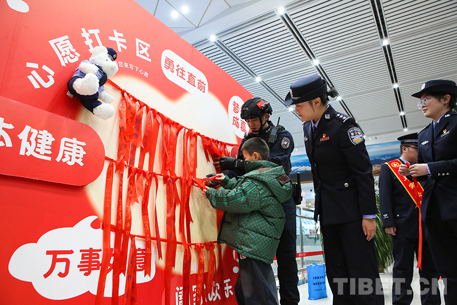 圖為春運(yùn)期間,青藏鐵警在格爾木站候車廳開展情暖回家路活動(dòng)