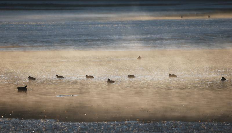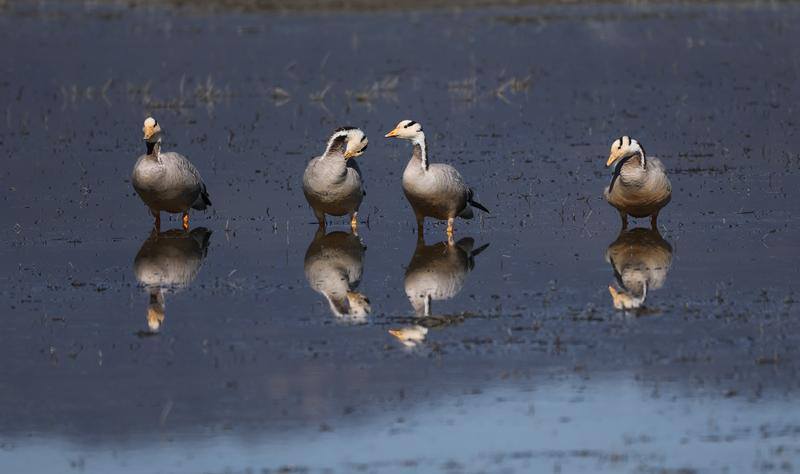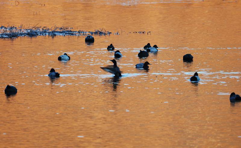 各類野鴨在湖中巡游,展現(xiàn)出一幅萬物共生自然和諧的山水畫卷。