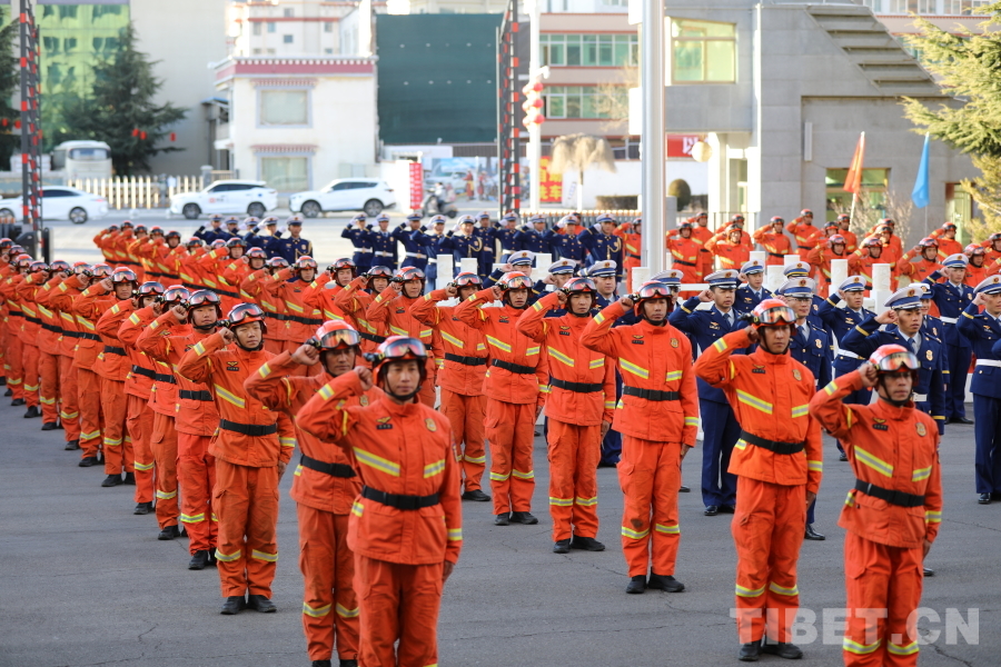 儀式在莊嚴的升國旗儀式中拉開序幕。雄壯的《義勇軍進行曲》響徹高原,鮮艷的五星紅旗冉冉升起,全體參會人員肅立注目、神情莊重,向國旗致以崇高敬意。升旗儀式結束后,相關領導共同為“拉薩消防救援機動支隊”揭牌,隨著紅綢緩緩落下,現(xiàn)場掌聲雷動,標志著這支傳承高原火焰藍光榮傳統(tǒng)、肩負全新使命的救援機動隊伍正式組建成立。