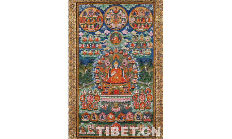 圖為畢紅演講展示的《乾隆皇帝佛裝像唐卡》。圖中,乾隆皇帝身著紅色袈裟,頭戴黃色班智達(dá)帽,結(jié)跏趺坐。蓮花座下有藏文,大意是“文殊菩薩化身,大德法王”。類似這樣的“自畫像”不僅表明乾隆對藏傳佛教的尊崇,也表明了他本人的宗教信仰。(圖中文物為故宮藏品)