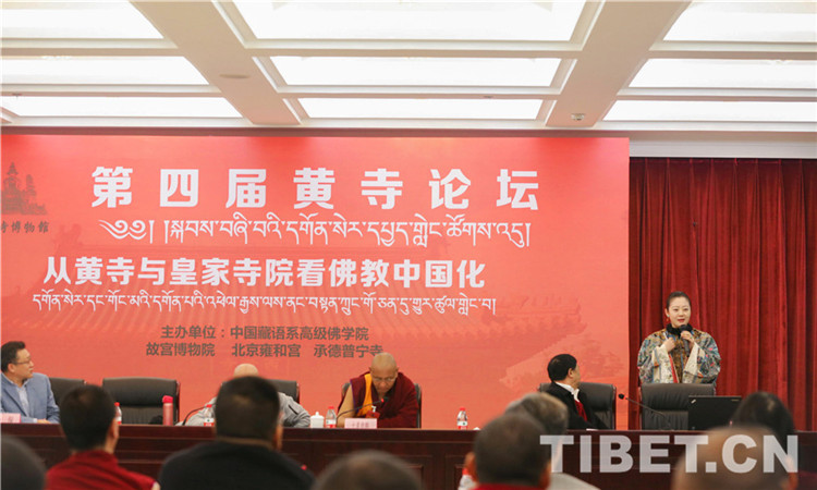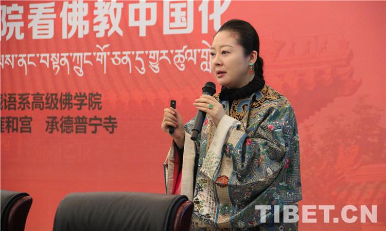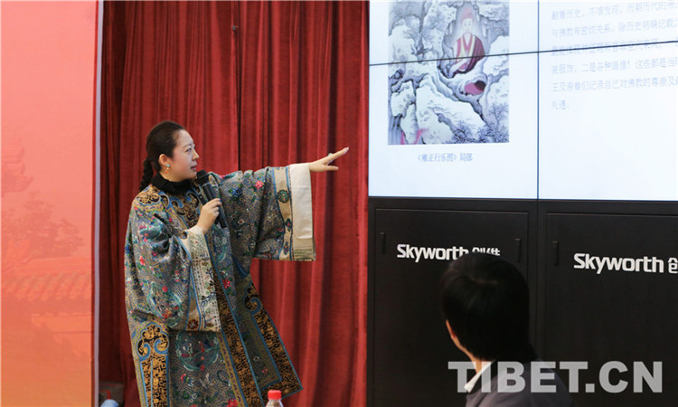 近日,在第四屆黃寺論壇上,中央民族大學(xué)美術(shù)學(xué)院客座教授畢紅,身著一襲有著兩百余年歷史風(fēng)格的古典美衣,從“皇家服飾里的佛教文化元素”視角,闡述了中華傳統(tǒng)文化與佛教文化的歷史淵源。圖為畢紅作演講。