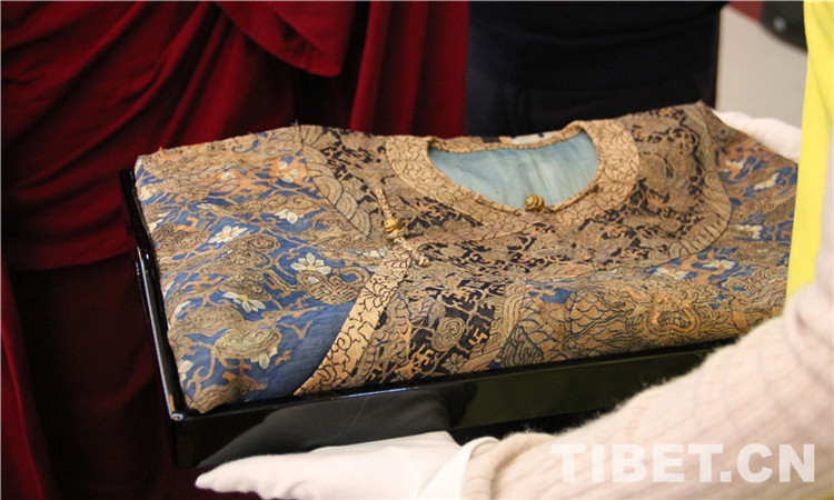 圖為畢紅演講展示的清朝瓔珞衣,是密教用骨做裝飾的一種法衣。衣分五彩,白、藍(lán)、黃、紅、綠,分別代表五方佛之中央毗盧佛、東方阿閦佛、南方寶生佛、西方阿彌陀佛、北方不空成就佛。(圖中文物為故宮藏品)