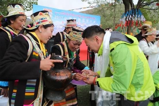 圖為西藏山南瓊結(jié)縣強吉村三組村民為遠方來的游客敬獻青稞酒。攝影:曲杰