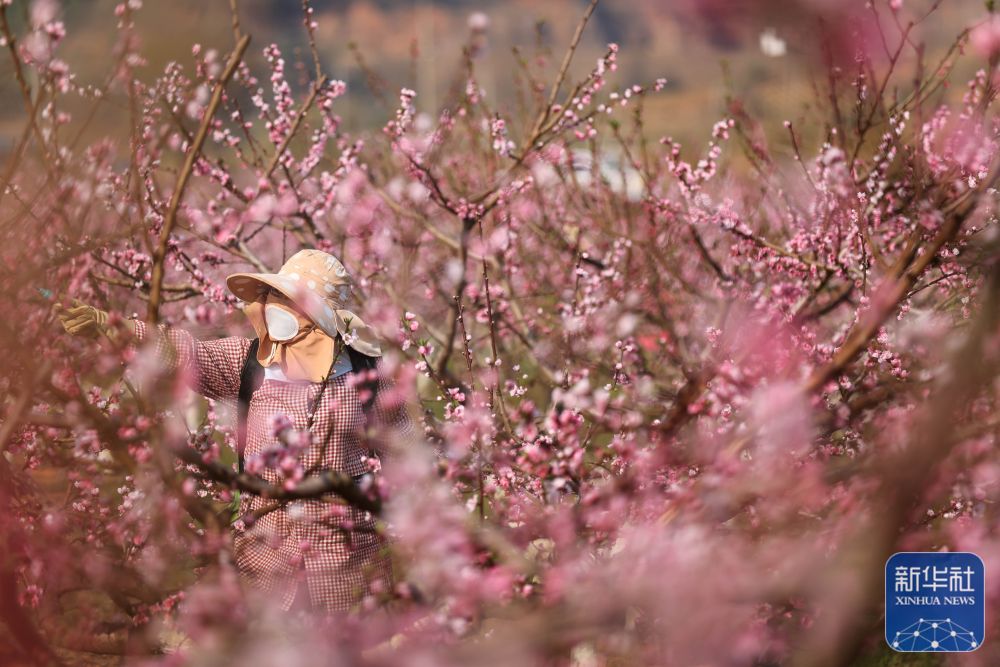 3月17日,在云南省曲靖市沾益區(qū)盤江鎮(zhèn)河西村桃園基地,果農(nóng)在果園進行管護作業(yè)。新華社發(fā)(孫文來攝)