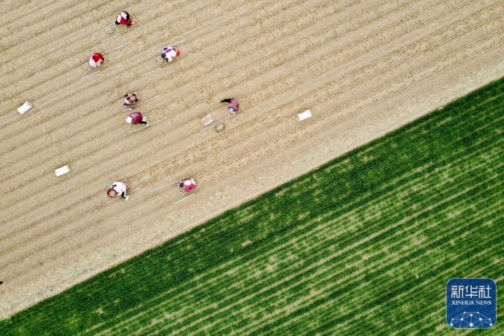 3月17日,河南省焦作市溫縣黃莊鎮(zhèn)南韓村農(nóng)民在田間種植鐵棍山藥(無人機照片)。新華社發(fā)(徐宏星攝)