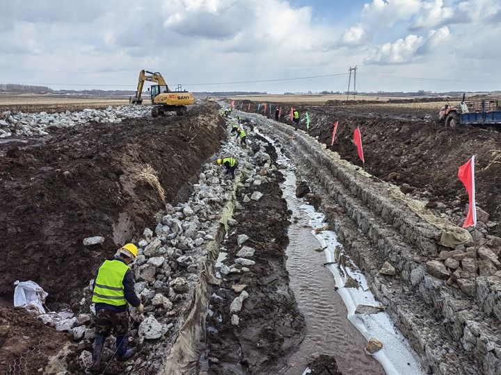 3月20日,在吉林省榆樹市黑林鎮(zhèn)豆坊村高標準農田建設現(xiàn)場,工人們在修繕排水溝渠。