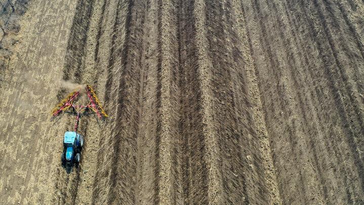 4月2日,在吉林省公主嶺市范家屯鎮(zhèn)乾程農民專業(yè)合作社,農民駕駛農機整理耕地上的秸稈(無人機拍攝)。