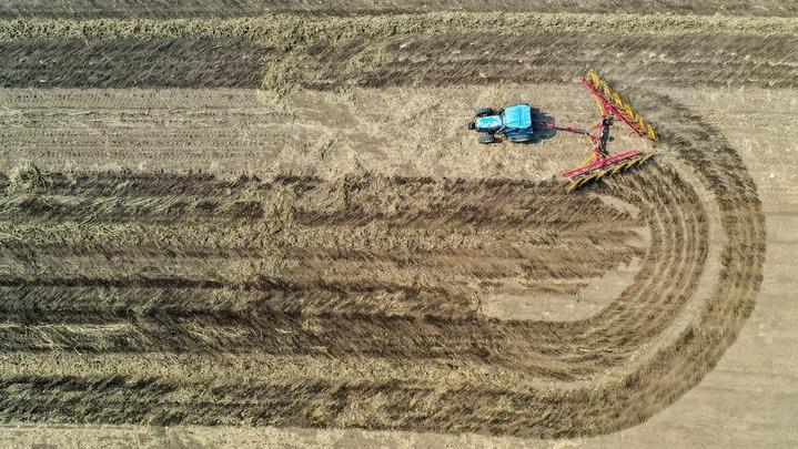 4月2日,在吉林省公主嶺市范家屯鎮(zhèn)乾程農民專業(yè)合作社,農民駕駛農機整理耕地。