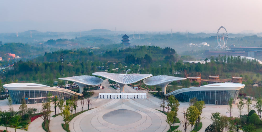 這是成都世園會主會場入口,鋼質(zhì)建筑相連形成三朵高大的“芙蓉花”(2024年4月22日攝)。新華社記者 王曦 攝