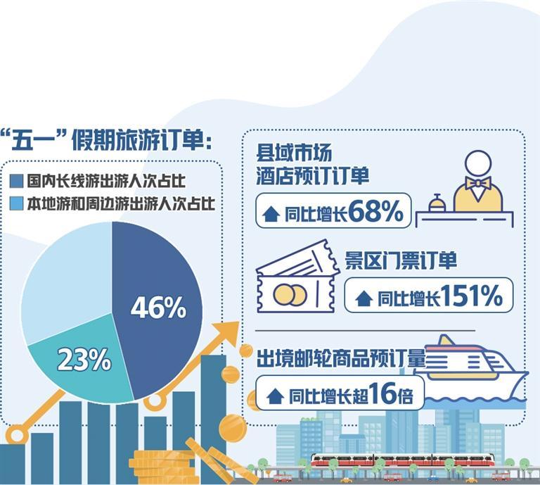 從出游目的地看,北京、上海、重慶、杭州、成都、南京、西安、武漢、廣州等城市是熱門,帶動相關交通和酒店訂單量走高。去哪兒旅行網(wǎng)顯示,北京—上海、成都—西安、上?!錆h、深圳—長沙、北京—青島等熱門線路的火車票預約購票難度不低于春運;從上海、北京、深圳、廣州、杭州、南京等地出發(fā),飛往旅游城市的機票平均支付價格走高,北京—成都、上?!ッ鞯葻衢T航線的部分航班已升至全價;在攜程旅行網(wǎng)上,天水、徐州、淄博、合肥、南昌、迪慶、煙臺等城市的“五一”假期酒店預訂增速明顯;四線及以下城市,尤其是縣域旅游市場帶來新增量,縣域市場酒店預訂訂單同比增長68%、景區(qū)門票訂單同比增長151%。