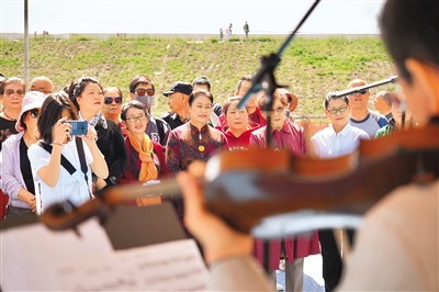 “我愛(ài)你,中國(guó)。我要把美好的青春獻(xiàn)給你,我的母親,我的祖國(guó)!”在軍墾之聲合唱團(tuán)的帶領(lǐng)下,市民游客一起合唱《我愛(ài)你,中國(guó)》,歌聲嘹亮,場(chǎng)面熱烈。