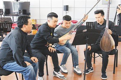 新疆藝術(shù)學(xué)院師生為中國(guó)交響樂(lè)團(tuán)作曲家楊帆(左一)展示彈撥爾樂(lè)器。