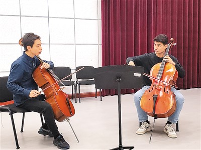 中國(guó)交響樂(lè)團(tuán)大提琴副首席李成(左)指導(dǎo)新疆藝術(shù)學(xué)院學(xué)生。