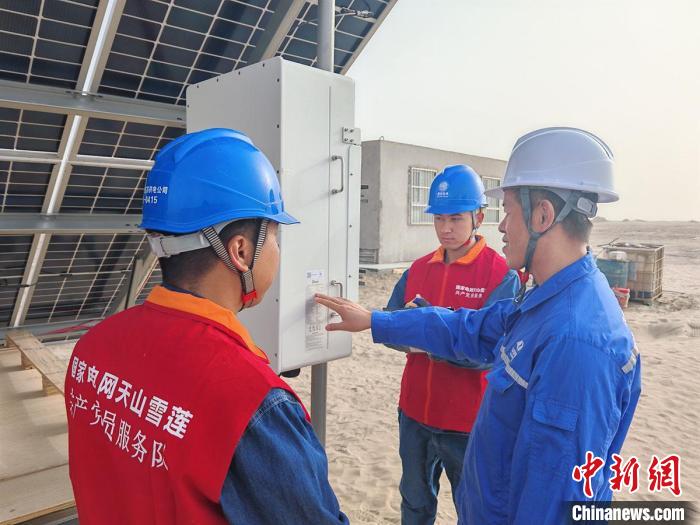 國(guó)網(wǎng)阿克蘇供電公司工作人員來(lái)到沙雅中電建25萬(wàn)千瓦光伏項(xiàng)目現(xiàn)場(chǎng),檢查光伏場(chǎng)站逆變器運(yùn)行情況。(馬海驕 攝)