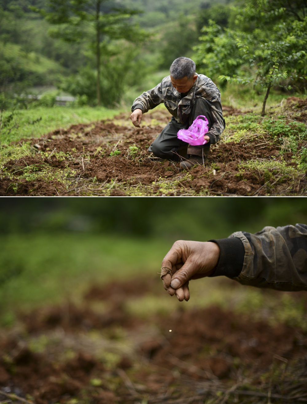 在廣西柳州市融安縣東起鄉(xiāng)銅板屯,村民龍革雄在山上播種(4月23日攝)。10多年來(lái),龍革雄返鄉(xiāng)創(chuàng)業(yè),和村民們一起發(fā)展水果種植和觀光旅游。